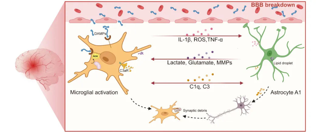 综述系统梳理了小胶质细胞与星形胶质细胞之间的多重反馈环路。活化的小胶质细胞可释放 IL-1α、TNF-α、C1q、ROS 等因子,诱导星形胶质细胞进入更具神经毒性的反应状态;而反应性星形胶质细胞又可顺利获得C3/C3aR轴、代谢产物释放、谷氨酸失衡以及细胞外囊泡等方式,反过来维持或强化小胶质细胞的促炎激活。