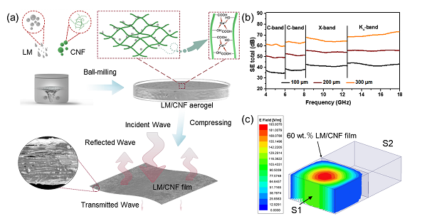 图 (a) LM/CNF复合薄膜的制备流程图; (b) LM/CNF复合薄膜具有优异的电磁屏蔽效能; (c) LM/CNF复合薄膜的电磁屏蔽仿真结果。
