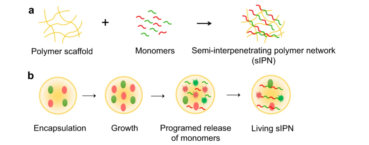 合成semi-IPN的思路。a) 传统的方法合成semi-IPNb) 利用合成生物学实现可模块化、多样化融合蛋白组分的活体semi-IPN的构建思路。