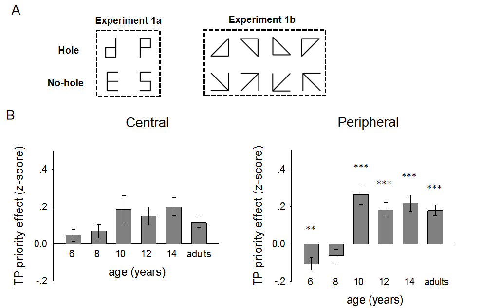 在儿童开展研究中,一般认为儿童对物体的常见属性的视觉感知,如高频光栅刺激的视敏度、颜色、形状、大小等,在6至7岁时已经达到成人加工水平。研究团队历时三年多,采集了近800名6-14岁儿童的数据,发现“整体优先”的现象在中央和外周视野有不同的开展变化规律(图1):对于中央视野,6-14岁儿童都表现出整体拓扑加工优势,且和成年人无差异;但是对于外周视野,整体优先直到10岁才出现。