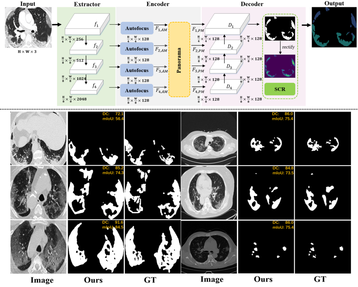 针对上述问题,团队提出了一种基于聚焦-融合-修正的深度网络架构,顺利获得设计的自动聚焦和全景聚合模块自适应的、整合了网络同级和跨层级的上下文信息,有效缓解了由于病变分布散乱、形状不规则等造成的识别精度低问题。进一步,网络架构中引入结构一致性修正机制,在学习过程中利用距离映射对每个像素及其周围区域进行编码,有效将区域的结构信息引入学习过程,提高了模型对复杂病变结构的感知,降低了其它信息的干扰。在新冠肺炎CT影像分割应用中,分割效果超过近期提出的多种深度学习方法。