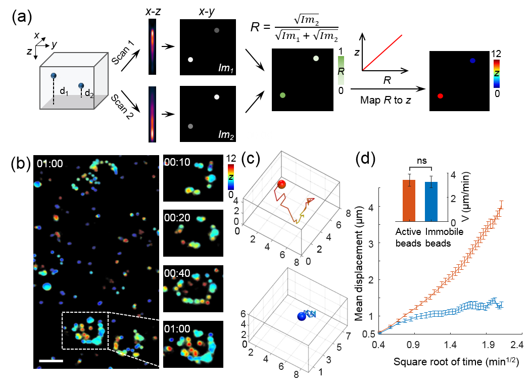 (a)所示,横向扫描第一梯度焦点得到的图像,位置浅处的样品荧光强度强,位置较深处样品荧光强度弱,第二个焦点对应的图像则正好相反。两幅图像的和反映了样品的真实三维荧光强度,图像的比值则反映了荧光的深度信息。该方法可以一次分辨深度12微米内三维信息,荧光点轴向定位精度为0.63微米。梯度光场双光子显微镜非常适合活体细胞的三维成像,在观测巨噬细胞吞噬荧光小球的实验中,能够快速捕捉荧光小球在巨噬细胞内三维运动轨迹,并精确定量出巨噬细胞运载小球的速度。