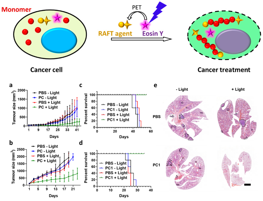 研究团队利用光控PET-RAFT聚合替代自由基聚合的方法,实现了分子量可预测、可调控的聚合物合成方法学开发,同时使所取得聚合物的分子量分布大幅降低,有效提高了聚合物的规整度,并且有效提高了细胞内聚合体系在时间、空间上的可控性和可重复性,大幅减少单体及引发剂的用量,降低聚合反应物体系本身对细胞产生的毒性。同时我们对细胞内聚合体系的应用潜力进行了进一步探索,以肿瘤治疗为目的对聚合单体库进行了更大范围的筛选,并成功开展了一种基于细胞内聚合的精准肿瘤治疗体系。顺利获得对细胞毒性的筛查研究,我们发现了一类本身具有较低毒性的丙烯酰胺聚合单体能够在聚合后显著提高其细胞毒性,高效引起肿瘤细胞的凋亡和坏死,和高效抑制肿瘤转移,并利用这一性质开发了一种全新精准肿瘤治疗方法。
