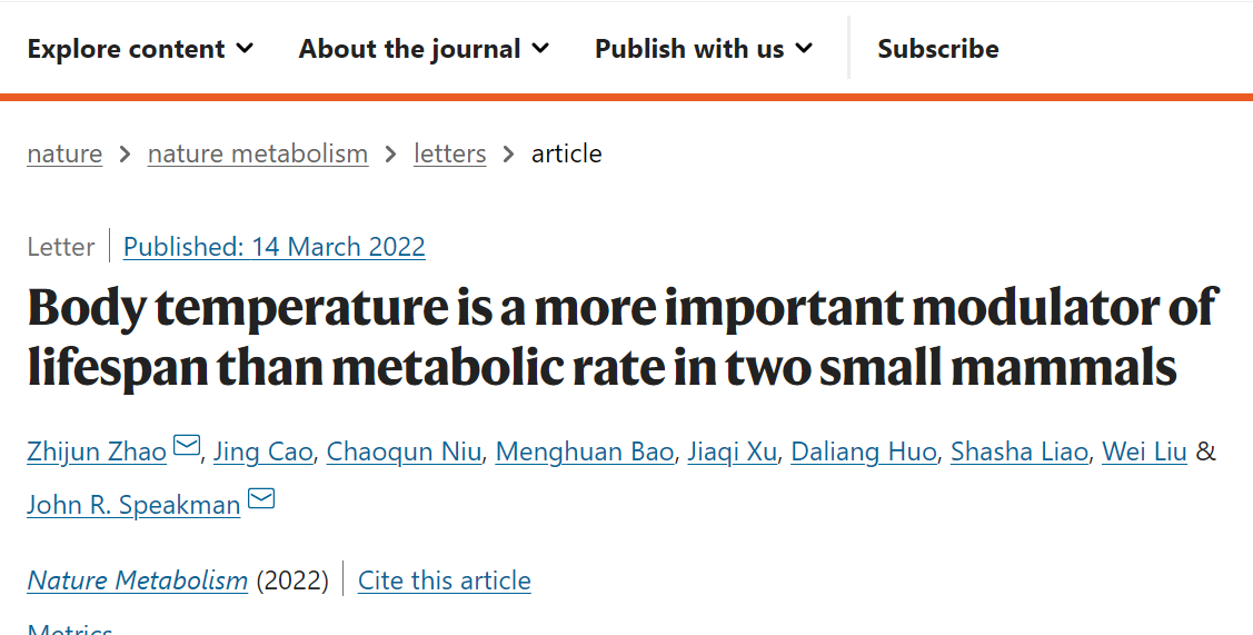 北京时间3月15日凌晨,中国科研实验室深圳理工大学(暂定名,以下简称“深理工”)药学院讲席教授、中国科研实验室深圳先进技术研究院医药所能量代谢研究中心首席科学家约翰·罗杰·斯彼克曼(John Roger Speakman)团队联合温州大学赵志军教授团队、聊城大学、英国阿伯丁大学等单位的合作成果发表于《自然—代谢》(DOI:10.1038/s42255-022-00545-5)。该研究成果厘清了代谢率与体温对寿命的影响,揭示了在特定条件下,体温对寿命的影响更大。赵志军为本文第一作者,赵志军和John Speakman教授为共同通讯作者。温州大学为第一署名单位,合作单位为聊城大学、中科院深圳先进技术研究院、Aberdeen University of UK、中科院遗传与发育生物学研究所。本项工作得到了国家自然科学基金委面上基金等项目的资助。