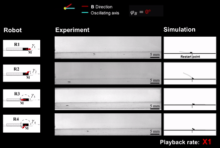 图2: 多个磁矩异构的软体微型机器人在相同振荡磁场中具体不同的速度响应
