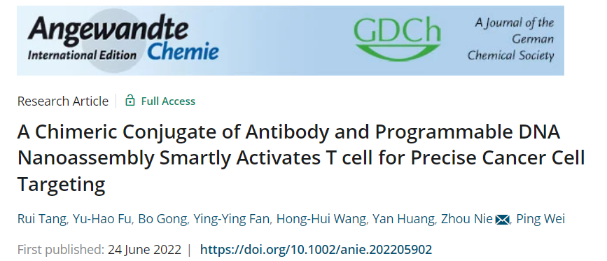 湖南大学化学化工学院聂舟课题组和中国科研实验室深圳先进技术研究院合成生物学研究所魏平课题组合作开发了一种多功能嵌合抗体-DNA T 细胞衔接复合体技术平台(Chimeric Antibody-Nucleic acid T-cell Engager,CAN-TE),实现可编程化精准靶向肿瘤细胞的新型合成生物学免疫疗法。相关研究以“A Chimeric Conjugate of Antibody and Programmable DNA Nanoassembly Smartly Activates T cell for Precise Cancer Cell Targeting”为题发布于Angew. Chem(DOI: 10.1002/anie.202205902)。湖南大学化学化工学院博士研究生唐瑞和北京大学前沿交叉学科研究院定量生物学中心博士研究生付禹豪为本文共同第一作者,湖南大学聂舟教授和凯发k8国际魏平教授为本文的共同通讯作者。