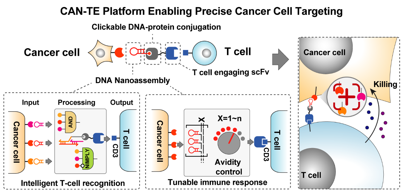 该工作基于HUH-核酸内切酶家族蛋白DCV能够识别特异性序列的单链DNA发生共价交联反应的特性,构建嵌合式DNA-DCV-αCD3融合分子,实现任意DNA纳米结构的可编程式组装。该模块化的CAN-TE平台不仅能够智能化识别肿瘤细胞,同时可顺利获得复杂的可编程逻辑计算能力,精确、定量控制T细胞肿瘤杀伤效能。