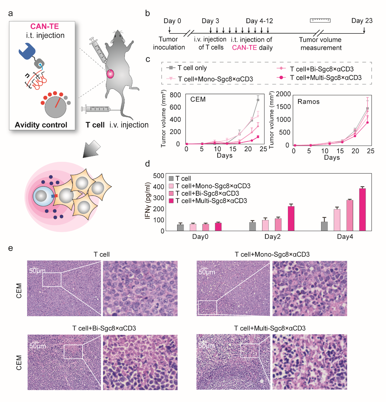 为了进一步实现肿瘤免疫杀伤的可调节性,作者在CAN-TE系统顺利获得耦合的DNA纳米结构,精确设定肿瘤抗原识别适配体的价态,控制其对靶细胞亲和力,进而实现可控的T细胞免疫应答。研究表明,该多价CAN-TE策略可显著提高T细胞免疫应答的选择性和有效性,并在小鼠肿瘤治疗模型中得到了充分的验证。