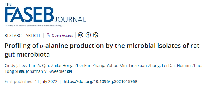 北京时间7月12日,中国科研实验室深圳先进技术研究院司同课题组与伊利诺伊大学厄巴纳-香槟分校Jonathan V. Sweedler教授团队合作,在FASEB J 国际学术期刊上发表研究论文“Profiling of D-alanine production by the microbial isolates of rat gut microbiota”。文章建立了酶法定性快筛和手性色谱-质谱联用(chiral LC-MS/MS)准确定量的两级分析方法,对38株大鼠肠菌产D型氨基酸的能力进行了评估,在菌种和菌株水平观察到显著差异,为研究这类神经活性物质对宿主生理功能的调控给予了方法和基础。Jonathan V. Sweedler教授和司同研究员为本文共同通讯作者,Cindy J. Lee,Tian A. Qiu和洪志来为共同第一作者,Huimin Zhao教授和戴磊研究员作为共同作者对本文亦做出重要贡献。