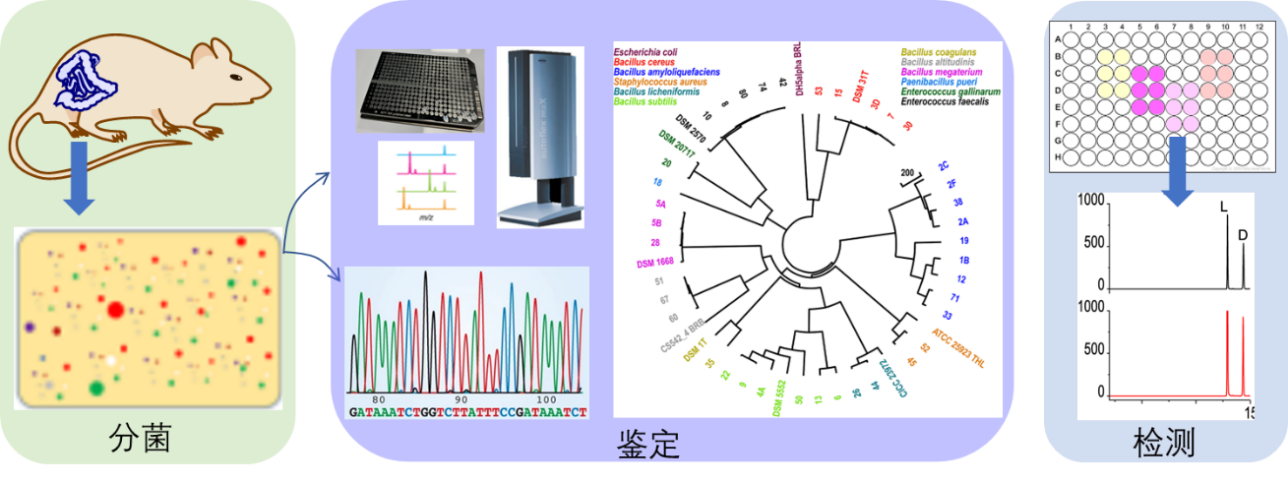 本研究第一时间建立了一个大鼠肠道菌的分离和鉴定的高通量方案,然后采用酶法快速筛选大鼠肠道菌产D型氨基酸的能力,最后经SCX-SPE富集后采用手性LC-MS/MS对这些主要生产菌株进行D型氨基酸产物谱的准确定量(图1)