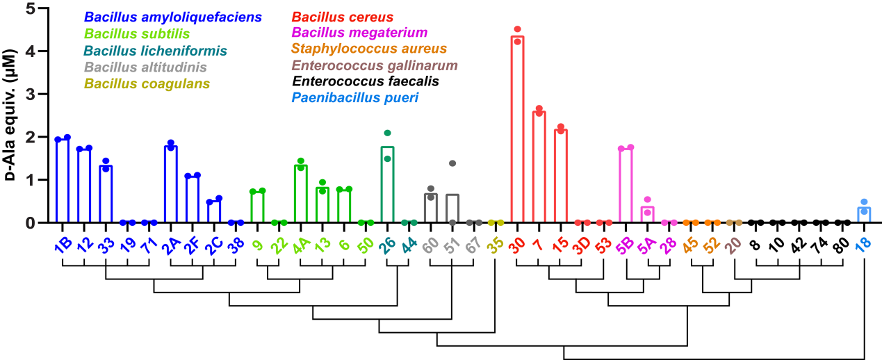 随后,作者设计了高灵敏度、稳定性,适合大规模筛选的酶标法探索这些肠道菌产生D型氨基酸的能力:收集平板上的肠道菌,提取并富集其分泌D型氨基酸,以底物宽泛性广的商用D型氨基酸氧化酶(DAAO)与过氧化氢检测试剂盒联用,对产物中的D型氨基酸的总量进行评价。结果显示只有芽孢杆菌属和类芽孢杆菌属的肠道菌能够产生D型氨基酸,且在芽孢杆菌属内,菌株在种和菌株的水平上产D型氨基酸的能力也有差异,并与16S rRNA相似度没有明显的相关性(图2),暗示单纯依靠16S rRNA测序取得微生物组菌种组成信息,无法准确预测菌群合成D型氨基酸的水平。