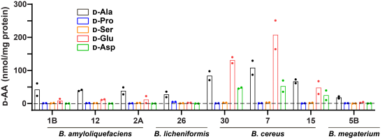 最后,鉴于DAAO对D型酸性氨基酸的活性较差,在确定了D型氨基酸的主要生产菌株后,作者顺利获得对其中产量最高的8株菌做进一步LC-MS/MS分析,对包括2种酸性氨基酸和宿主无法合成的D型丙氨酸在内的5D型氨基酸进行准确定量作者先将产物顺利获得SCX-SPE除盐并富集其中的氨基酸,并基于标准品计算这5D型氨基酸回收率。根据标准品的保留时间和额外加样,作者确定了这些样品中5种目标D型氨基酸的含量(图3)。值得注意的是,蜡样芽孢杆菌的D型氨基酸产物谱中存在高含量的两种D型酸性氨基酸,它们可能也存在于其他DAAO酶标法阴性的样品中。