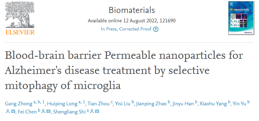 8月12日,中国科研实验室深圳先进技术研究院合成生物学研究所材料合成生物学中心于寅副研究员团队与广西医科大学第二附属医院石胜良教授团队合作的最新成果以“Blood-brain barrier Permeable nanoparticles for Alzheimer's disease treatment by selective mitophagy of microglia”为题在线发表于国际知名期刊Biomaterials