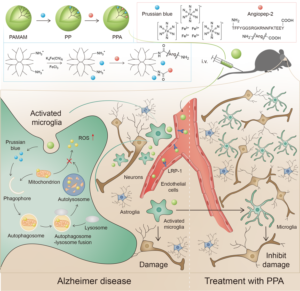 在该工作中,研究团队开发了一种拥有优异的血脑屏障(BBB)通透性的纳米颗粒,由普鲁士蓝/聚酰胺-胺型(PAMAM)树状大分子/血管生成素-2  (PPA)组成,顺利获得调节线粒体自噬,清除活性氧因子(ROS)恢复小胶质细胞的生理功能,从而治疗阿尔茨海默症。文章的第一作者为于寅课题组研究助理钟刚,共同一作为石胜良团队龙惠萍;于寅副研究员和陈飞副研究员、广西医科大学第二附属医院石胜良教授为共同通讯作者。