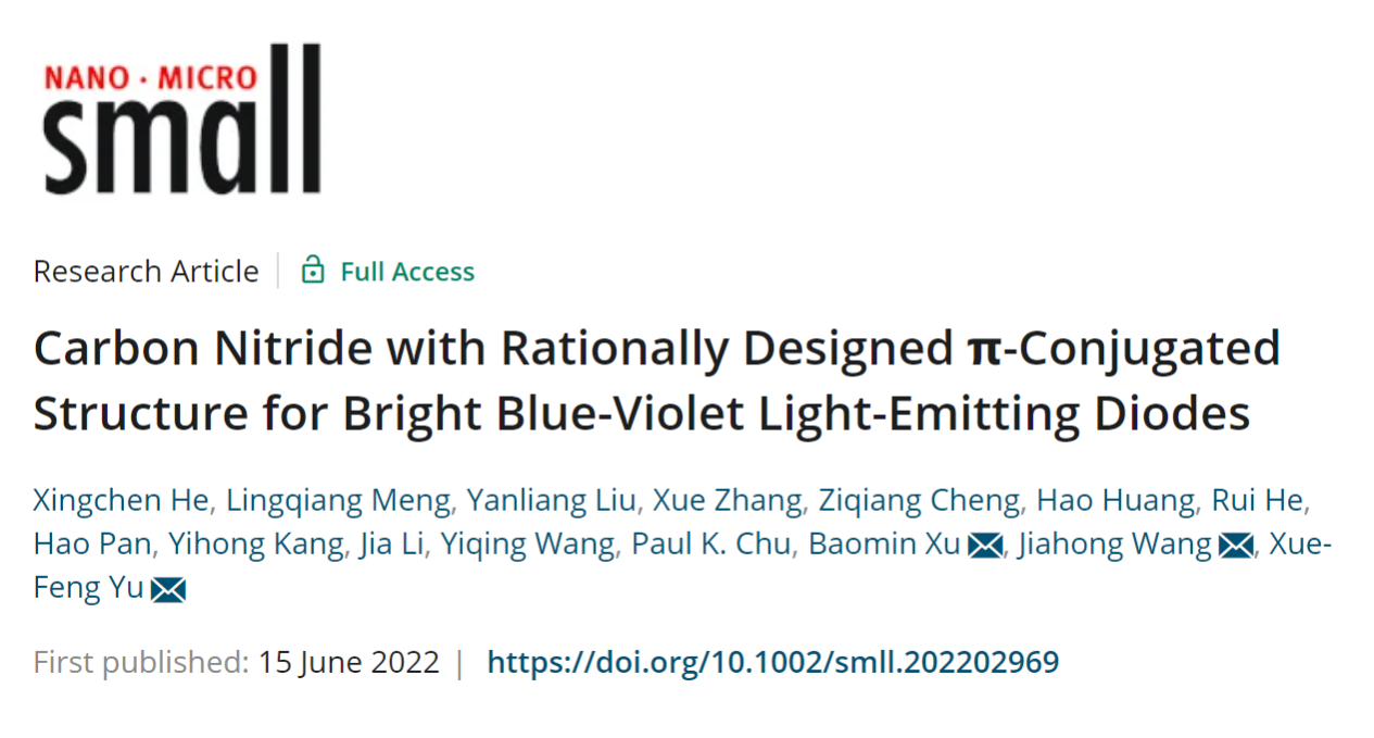 近期,中国科研实验室深圳先进技术研究院喻学锋、王佳宏团队和南科大徐保民教授团队合作,从改性二维氮化碳的单元结构出发,控制氮化碳的热聚合过程,取得了具有嗪环骨架破缺的二维氮化碳纳米片。该工作以“Carbon Nitride with Rationally Designed π-Conjugated Structure for Bright Blue-Violet Light-Emitting Diodes” 为题发表于材料类旗舰期刊Small(Small 2022, 18, 2202969),并被遴选为封面。