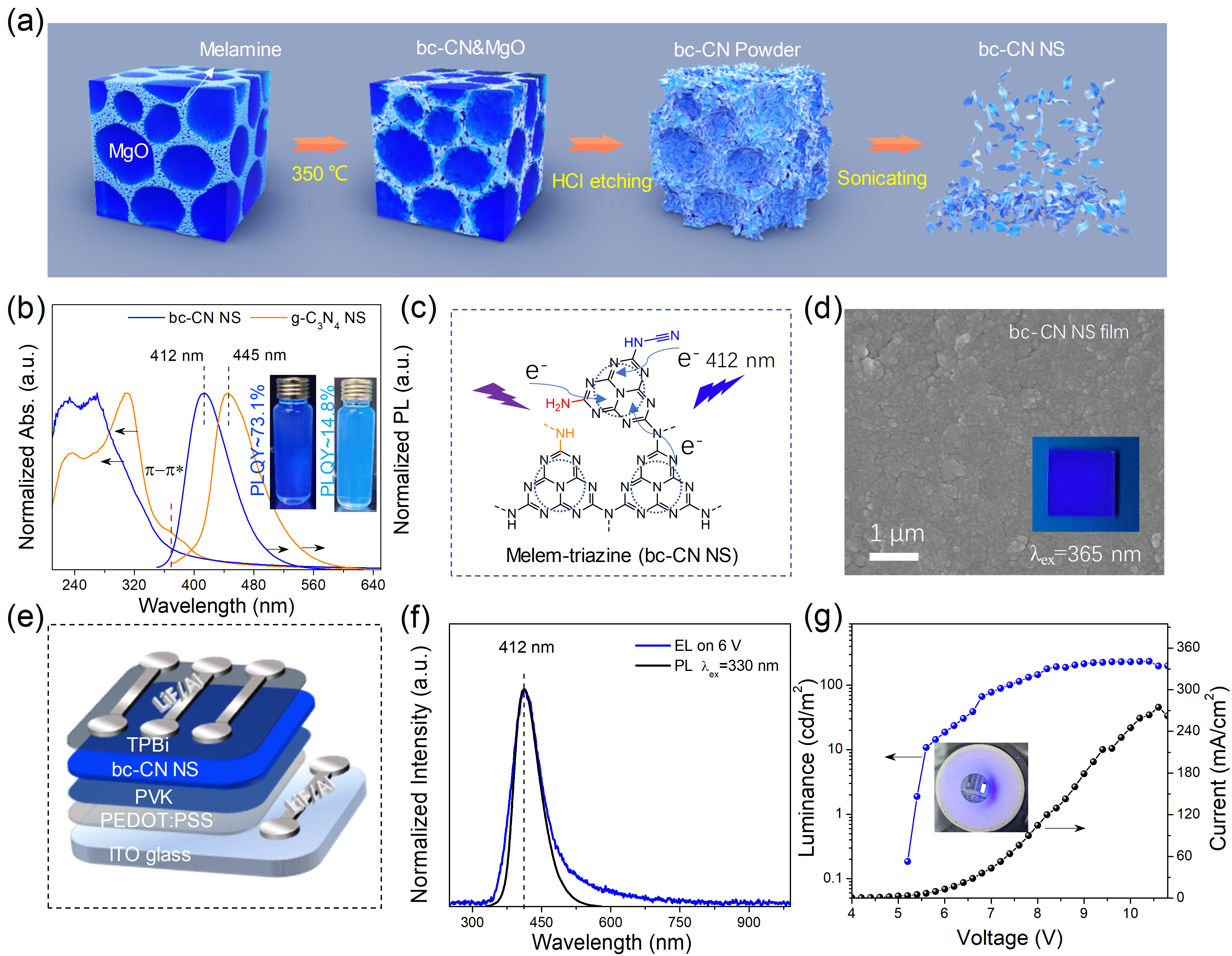 :具有不对称结构的二维氮化碳合成及性能:(a) 合成过程示意图; (b) 吸收光谱和荧光发射光谱; (c) 单元结构示意图; (d) 发光层形貌及365 nm光激发的荧光照片; (e) LED的器件结构; (f) 器件归一化光致发光光谱和电致发光光谱; (g) 器件的电流-电压-亮度关系及LED发光照片。