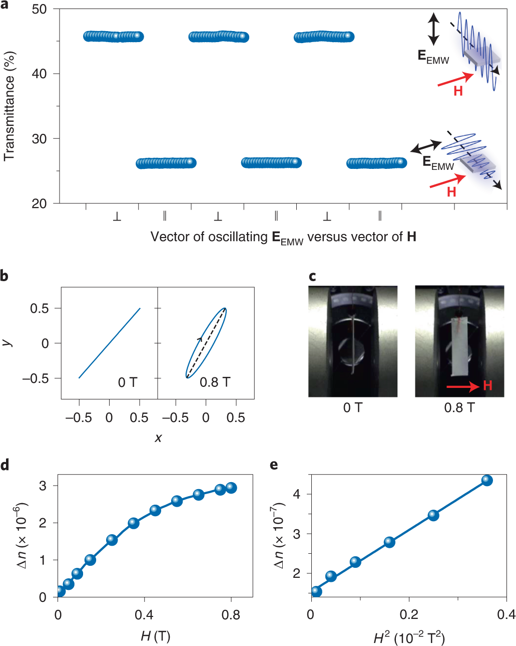 团队成员顺利获得观察入射光偏振态与磁场作用下液晶透射率关系的实验揭示了二维六方氮化硼在外场作用下顺磁场的排布方式。在入射光的偏振态被调整为平行和垂直于磁场的两种状态下,后者呈现较高的光透射率,间接印证了二维六方氮化硼纳米片平行于磁场方向排布。针对层状二维六方氮化硼薄膜的磁化率各向异性测试揭示了面内易磁化方向,进一步证实了二维六方氮化硼纳米片顺磁场排布的物理机制。结合二维氮化硼纳米片的极大的光学各向异性,因此发现了二维六方氮化硼液晶的巨磁致双折射效应。
