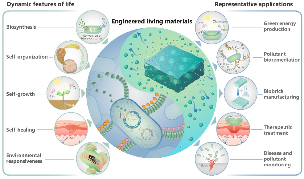 图1.工程活材料集成了生命的各种动态特征,如生物合成、自我生长、自我组织、自我修复和感知与响应环境等。工程活材料现已扩展到各种可持续应用,包括绿色能源的生物生产、污染物的生物修复、生物砖的制作以及作为医疗材料用于检测和治疗慢性疾病等。