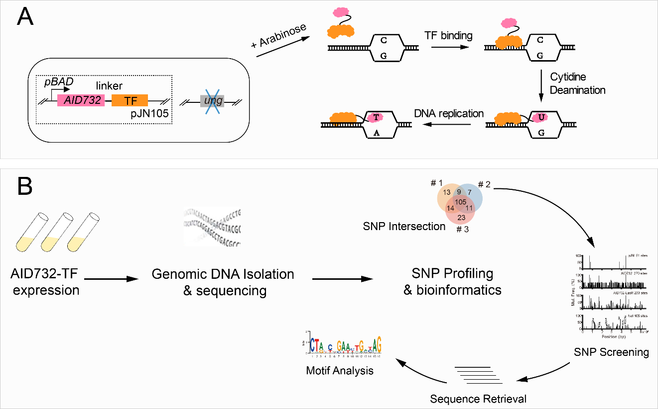 在本研究中,金帆团队开发了一种名为AIDmut-Seq的体内方法。活化诱导胞苷脱氨酶(AID)可以将单链DNA序列中的碱基C脱氨化形成碱基U, DNA复制后发生C-T或G-A替代。研究人员将AID融合到转录因子上,并在体内诱导融合蛋白表达,这样就可以在转录因子结合位点附近引入突变,后续可以顺利获得全基因组测序直接检测。由于不需要对转录因子结合的片段进行捕获富集,而仅需对突变标记进行测序,因此AIDmut-Seq的整个工作流程仅包含细菌培养、基因组提取和生信分析三个步骤(图 1),不涉及其他复杂的实验操作,大大节省了实验人员的时间和劳动成本。