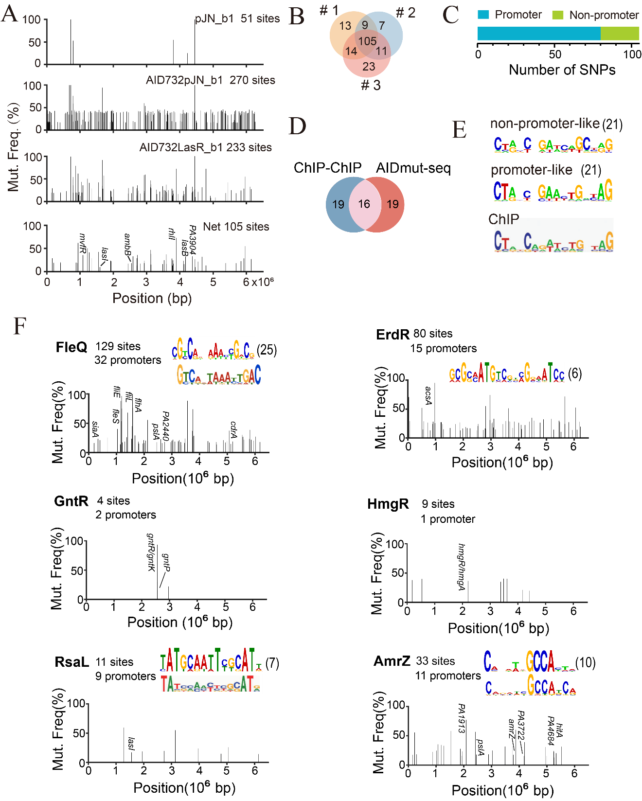 研究人员使用不同类型的转录调节因子对AIDmut-Seq进行了验证,表明该方法对大多数转录激活因子(如LasR,FleQ,ErdR,GacA,ExsA等)的具有较高效率。而对一些小的转录抑制因子(如RsaL和AmrZ等)虽然表现出较低的效率,但顺利获得该方法计算得到的转录因子识别基序(motif)和现有方法得到的基序具有很大相似性。此外,使用AIDmut-Seq还得到了许多之前没有发现的转录因子结合位点和新的调节模式。这些结果证明了AIDmut-Seq的高效性和泛用性,可以作为现有方法的重要补充工具(图2)。