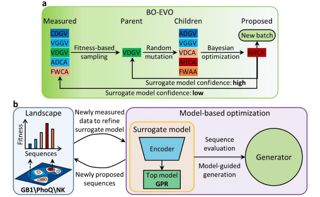 图1. BO-EVO原理图。a. BO-EVO算法流程展示搜索空间演化; b. FAST-HIT软件框架实现数据获取、模型构建与序列推荐的闭环迭代。