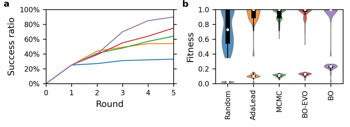 图2. 适应度地形探索算法比较。a. 找到全局最优的成功率;b. 算法所推荐的序列的适应度均值及最大值。