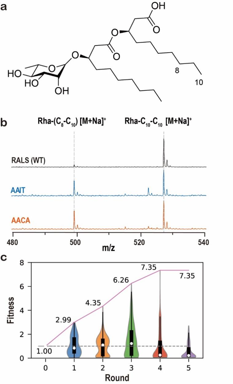 4. BO-EVO指导RhlA酶的4位点组合优化。a. 鼠李糖脂单体Rha-C10-C10分子结构;b. 鼠李糖脂单体的MALDI质谱检测结果,包括野生型与典型变体;c. Rha-(C8-C10)的归一化产量,野生型为1。