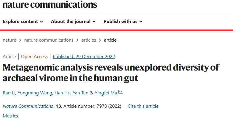 北京时间12月30日,中国科研实验室深圳先进技术研究院合成生物学研究所马迎飞团队在国际学术期刊《自然-通讯》(nature communications,IF=17.69)上发表了题为"Metagenomic analysis reveals unexplored diversity of archaeal virome in the human gut"的文章。该工作首次对来自人类肠道宏基因组的古菌病毒进行了深入挖掘及全面分析,揭示了人类肠道中古菌病毒组的多样性,为人类肠道古菌病毒组的研究给予了前所未有的一瞥。