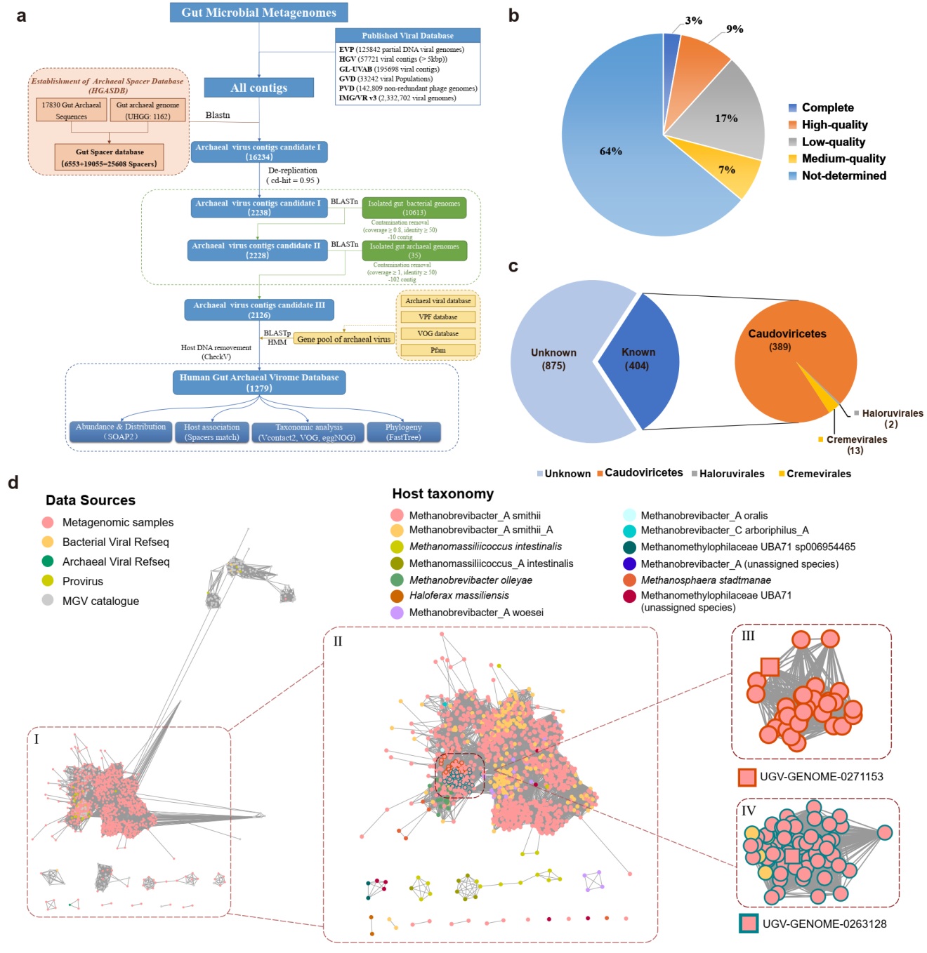 研究表明约有90%古菌基因组包含CRISPR结构1, 因此CRISPR spacer-protospacer的匹配分析适用于古菌病毒序列的识别为了对人类肠道中的古菌病毒进行全面搜索,团队第一时间构建了人类肠道相关古菌spacer序列数据库 (HGASDB, Human Gut Associated Archaeal Spacer Database),并基于HGASDB和古菌病毒的特征基因构建了一套肠道古菌病毒的鉴定方法,收集的2271肠道宏基因组样品中6个公开的病毒数据库中共鉴定出了1279古菌病毒,构成人类肠道古菌病毒组数据库 (HGAVD) (1a)。随后,团队对鉴定出的病毒代表序列进行质量评估,大多数 (67%) 病毒contigs的质量无法得到评估。与此同时,团队基于对病毒序列的网络分析以及病毒蛋白序列的注释信息,对HGAVD中的病毒序列进行了分类学的分析,其中大部分序列 (68.4%) 无法被分类到任何已知的病毒类别,这些分析表明人类肠道中依然存在大量未知的古菌病毒。此外,团队还HGAVD中的病毒公共的肠道病数据库进行了比较(1d),发现来自HGAVD大多数病毒 (n=1,097; 86%) 均无法与公共数据库中的病毒聚类到一起,这表明HGAVD肠道古菌病毒组具有良好的代表作用。综上所述,HGAVD极大地扩展了人类肠道中古菌病毒多样性。