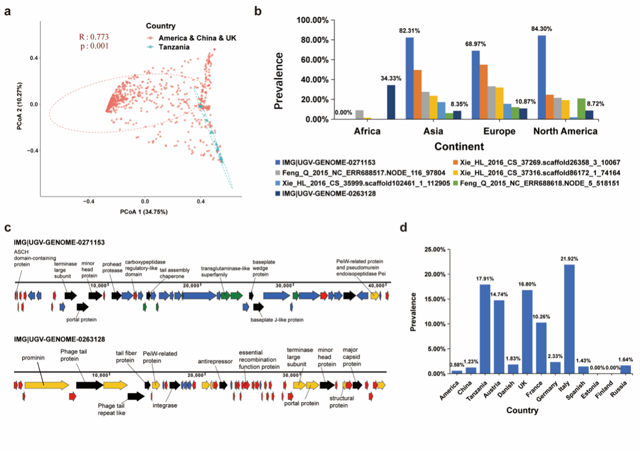 为了分析肠道古菌病毒在全球人群中的分布情况,团队对1279古菌病毒contigs在人类肠道样品中的丰度情况进行了估计,主坐标分析 (PCoA) Anosim分析的结果显示:肠道古菌病毒群落组成在不同性别 (ANOSIM, r = 0.004, p = 0.306) 和不同BMI指数 (ANOSIM, r = 0.006, p = 0.201) 的人群中并无显著性差异。然而,当以国家作为界限分析时,我们观察到这些古菌病毒在各地表现出不同的多样性(2a)