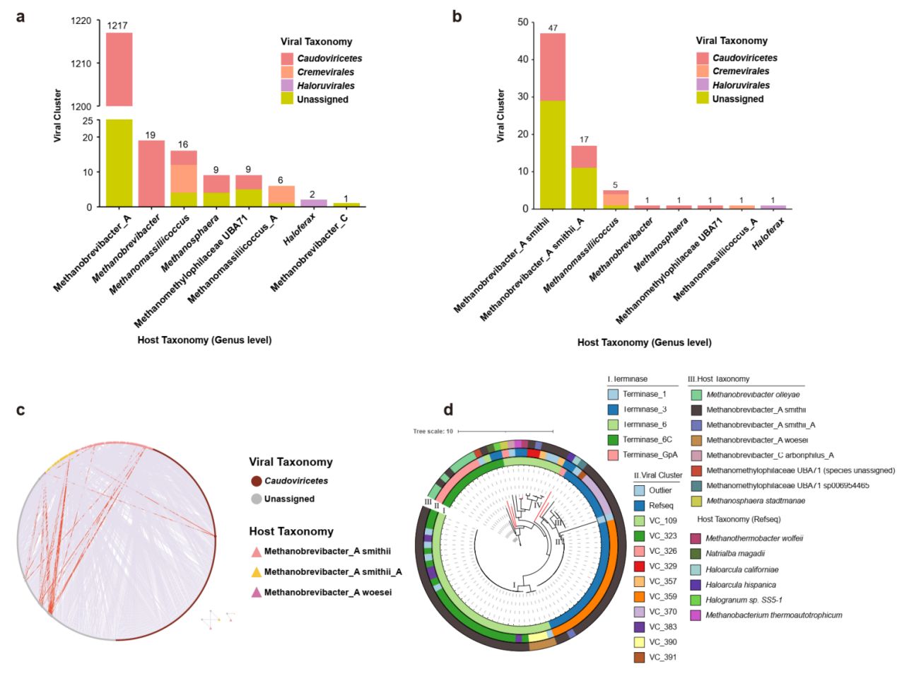 此外,侵染M.smithii的病毒是人类肠道古菌病毒的一个主要分支,为了进一步探索有尾古菌病毒的多样性,团队以末端酶大亚基 (Terl, Large Subunit Terminase) 作为标记构建M.smithii古菌病毒的系统发育树,以此来估计这些病毒的多样性(图3d以上基于Terl蛋白的系统发育分析扩展了M.smithii古菌病毒的多样性,并定义了新的谱系。