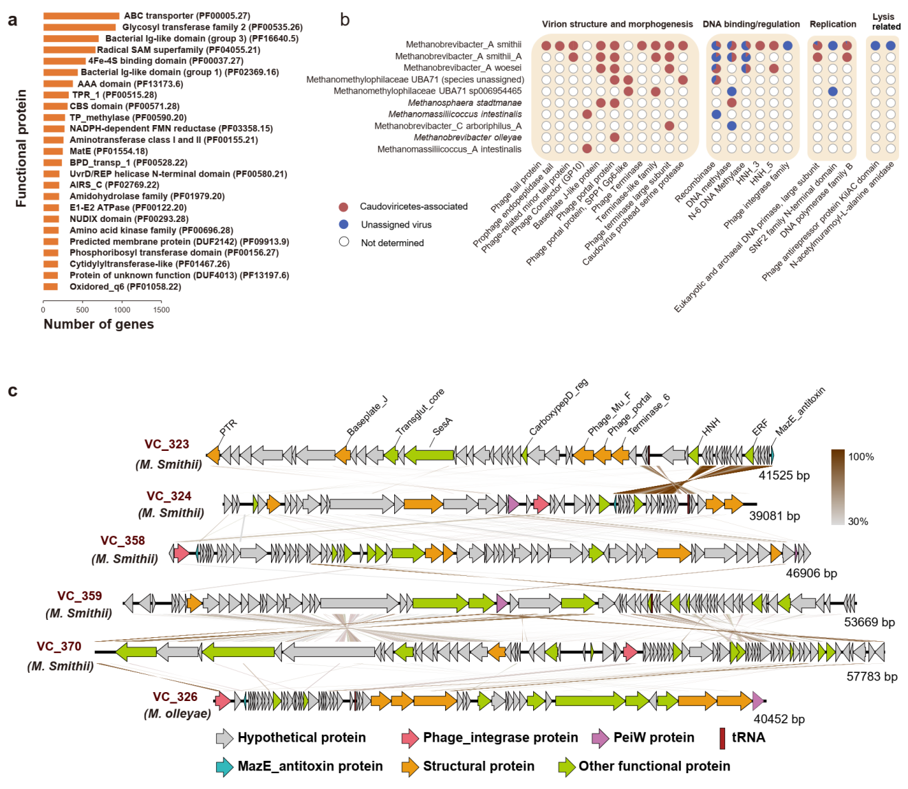 在所有鉴定出的肠道古菌病毒中,M.smithii古菌病毒的蛋白功能最为多样,共包含了1034种不同功能的蛋白 (只考虑了被指定生物功能的蛋白) ,其中包括一些病毒特有的功能蛋白,例如与结构、包装、裂解、DNA结合/调控和复制相关的蛋白,其他一些古菌病毒则缺乏这些病毒特有的功能蛋白 (4b)此外,团队还对36条完整古菌病毒代表序列的基因组进行了研究 (4c),其中23条序列携带PeiW(pseudomurein endoisopeptidase)基因,揭示了该基因对病毒侵染产甲烷古菌的重要性。此外33种有尾病毒基因组的分析结果表明,人类肠道中的细菌病毒类似,温和古菌病毒在人类肠道古菌病毒占据主体地位。