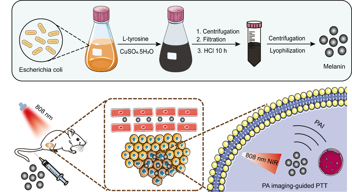 光热治疗作为一种肿瘤光学治疗策略,可以有针对性地在局部杀死癌细胞,在恶性肿瘤治疗方面具有微创、长效、安全等特点。但许多光热疗剂由于生物相容性差、生产和加工过程反应方法复杂、反应条件苛刻等治疗效果并不理想因此,在环境友好的条件下开发生物相容性好的光热疗剂具有重要的研究意义。而黑色素作为一种多功能色素,被广泛应用于能源和生物医学等领域,特别是癌症的成像诊断和光热疗法。现在市面上的黑色素主要是顺利获得化学合成或从乌贼中提取取得的,这些方法并不适用于大规模生产。与之相较,生物合成黑色素则具备反应条件温和,环境友好,生物相容性好等优势