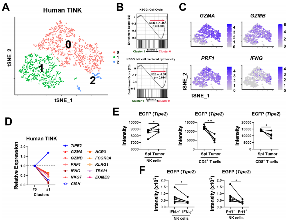 图2. TIPE2的表达水平与肿瘤相关NK细胞的功能耗竭相关