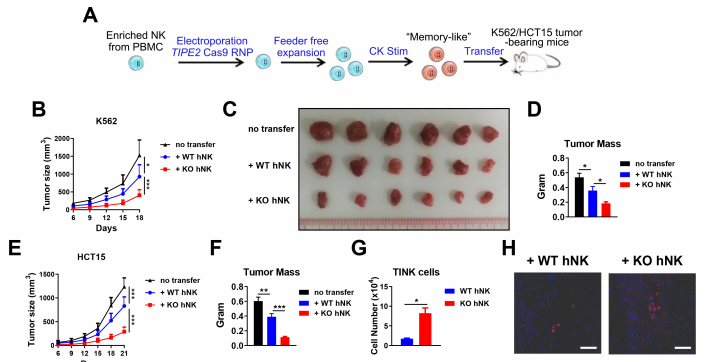 于是研究人员在人外周血来源的NK细胞及人诱导多能干细胞来源的NK细胞中,顺利获得CRISPR/Cas9手段敲除TIPE2基因,然后在体外顺利获得细胞因子诱导“记忆样”NK细胞的功能增强状态,随后转输到荷瘤小鼠,并发现TIPE2敲除的NK细胞相比对照NK细胞而言显著抑制肿瘤生长,并伴随NK细胞在肿瘤组织中更高的浸润水平(图3)。该研究表明靶向敲除胞内卡控点分子TIPE2可以阻滞NK细胞在肿瘤微环境中的免疫耗竭水平,促进NK细胞的浸润及功能,从而促进过继NK细胞的肿瘤免疫治疗,提示靶向TIPE2是促进NK细胞治疗的潜在策略。