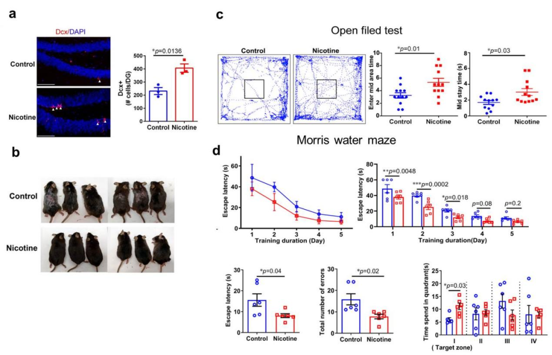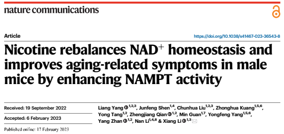 1. Yang, L. et al. Nicotine rebalances NAD+ homeostasis and improves aging-related symptoms in male mice by enhancing NAMPT activity. Nature Communications 14, 900, doi:10.1038/s41467-023-36543-8 (2023).