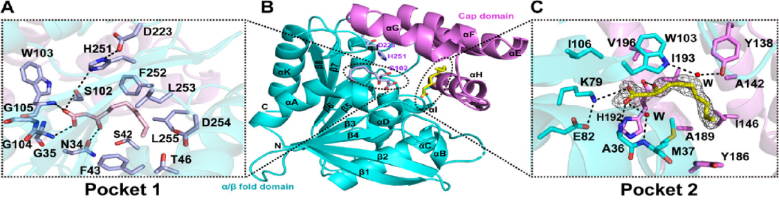 为克服这些局限,本研究顺利获得X射线晶体学方法首次解析了铜绿假单胞菌(Pseudomonas aeruginosa)来源RhlA的蛋白质结构,揭示了RhlA具有α/β水解酶折叠结构。出乎意料的是,Ser-His-Asp催化中心附近经典的配体结合口袋1外,研究人员还发现了另外一个配体结合口袋2,该口袋中结合有游离3-羟基脂肪酸,推测可能是反应中间体