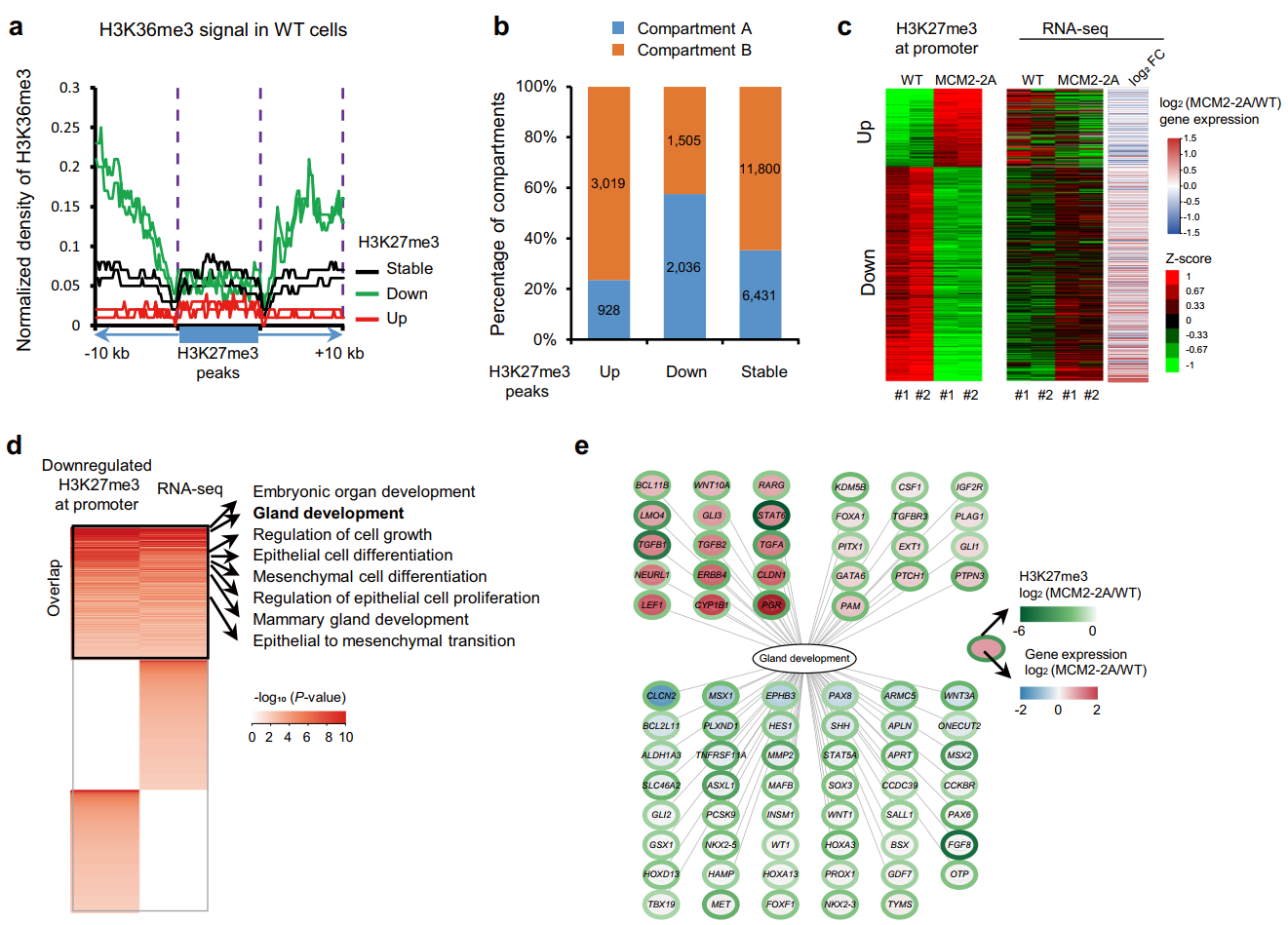 为了深入探讨组蛋白遗传在肿瘤进展中的作用,甘海云团队在人类乳腺癌细胞中顺利获得突变MCM2与组蛋白结合的结构域或敲除POLE3成功构建了组蛋白遗传受损的肿瘤细胞模型,并发现破坏肿瘤细胞的组蛋白遗传后,肿瘤细胞的表观遗传谱发生了剧烈的改变(图1)。