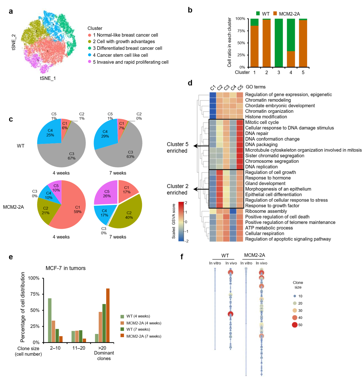 研究团队将组蛋白遗传受损的乳腺癌细胞原位植入小鼠乳腺,发现其生长显著增快,侵袭性增强,小鼠肺转移明显增多(图3)。进一步的单细胞测序揭示了组蛋白遗传受损的细胞在植入体内后出现了两个新的亚群,这两个亚群是导致肿瘤细胞的快速增殖和侵袭性增强的主要因素。随后的谱系追踪结果显示,组蛋白遗传受损后肿瘤细胞更容易取得适应性优势从而形成优势克隆,这些新出现的具有优势的克隆促进了肿瘤细胞的进化(图4)。