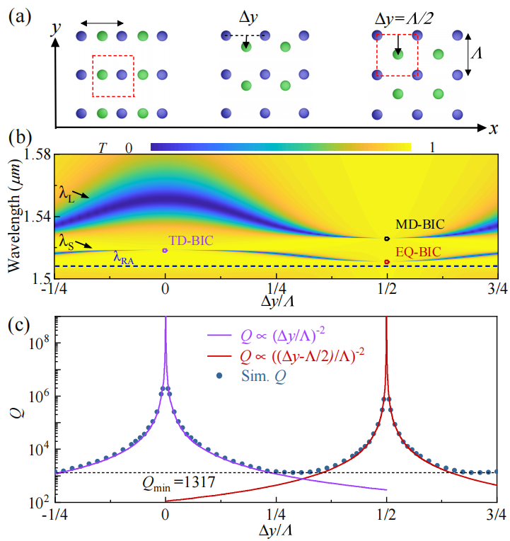 图1. a) 随不对称参数Δy变化的杂化晶格演化示意图。b)透射谱和c) Q值随着Δy变化的演化,显示在短波长处TD-BIC与EQ-BIC发生相互转化