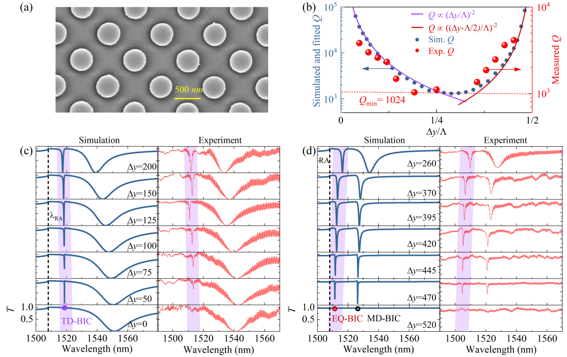本文中,研究团队采用两个相同晶格错位杂化。图1的仿真结果表明:随着相对位移Δy的变化,在短波长处会出现TD-BIC与EQ-BIC之间的相互转化,从而准BIC模式的最低Q值被极大提升(仿真值均大于1317)。研究采用常规的微纳加工工艺,制备了一系列由周期性纳米硅柱阵列形成的超构表面。图2的实验测量结果表明:实验测量结果与仿真结果非常吻合;首次在实验中观察到了TD-BIC与EQ-BIC之间的转化;最大实验Q值达到了4130,最小的实验Q值也有1024。这意味着设计所得的超构表面准BIC模式的Q值具有极高的鲁棒性。