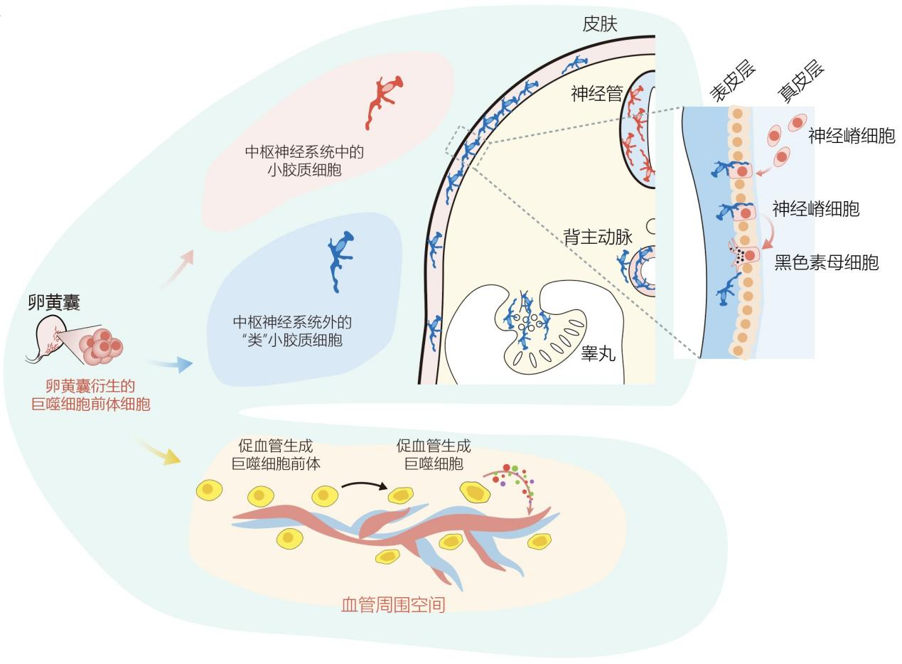 表皮和中枢神经系统均起源于外胚层,而主动脉和附睾则起源于主动脉-性腺-中肾(aorta-gonad-mesonephros, AGM)区域。研究团队推测,小胶质细胞以及类小胶质细胞的前体从卵黄囊迁移到外胚层和 AGM 区域,随后在这两个区域独立分化为小胶质细胞或类小胶质细胞。