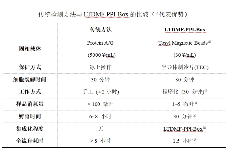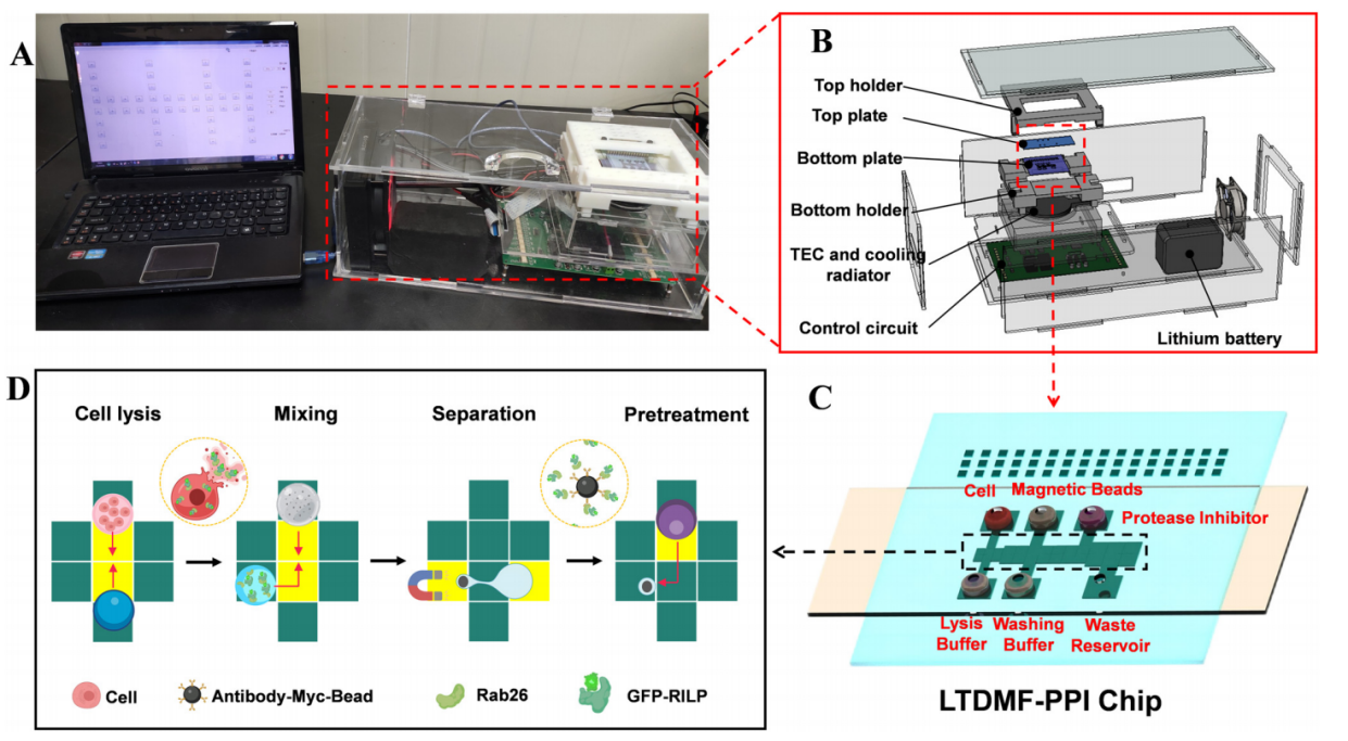 蛋白质-蛋白质相互作用(Protein-protein interaction, PPI)是生命体系中最基本的一种现象,它们在细胞内扮演着重要的角色。各种生物学过程和疾病的发生、开展和预测都离不开蛋白质-蛋白质之间的相互作用,研究蛋白质之间的相互作用对于理解疾病的发生、开展具有重要的意义,顺利获得科学方法精准测定其作用途径和作用方式等本质信息,能够极大助力诸如新型药物靶标发现等生物医学研究及药物研发。现在,常见的PPI的检测方法有串联亲和纯化、荧光共定位、荧光双分子互补、荧光能量共振转移、免疫共沉淀和蛋白质芯片等。上述方法通常自动化程度不足,难以高效实现并行检测;此外,受限于当前检测技术在检测灵敏度及检测速度上的不足,难以实现高效、精准的PPI测量。为解决上述难题,研究人员开发了一种基于低温数字微流控系统的PPI检测盒(LTDMF-PPI-Box),以实现自动、快速、无损、高效的PPI检测。LTDMF顺利获得编程控制液滴的运动,将PPI的检测时间从数十小时缩短至1.5小时。此外,集成热电冷却器(TEC)可确保蛋白质的工作温度,将蛋白质的保存率提高至90%以上,以利于后步的操作及应用。该团队以与胰岛素分泌密切相关的RILP蛋白和Rab26蛋白之间的相互作用作为原型,进一步证明了LTDMF-PPI-Box的可行性。
