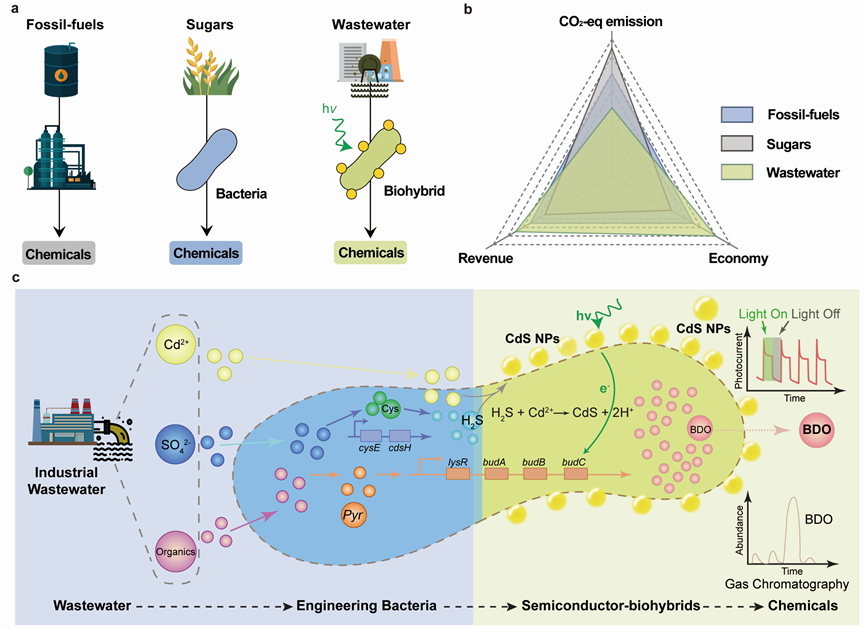 图1. 基于废水的半导体材料-细菌杂合体光驱生物制造