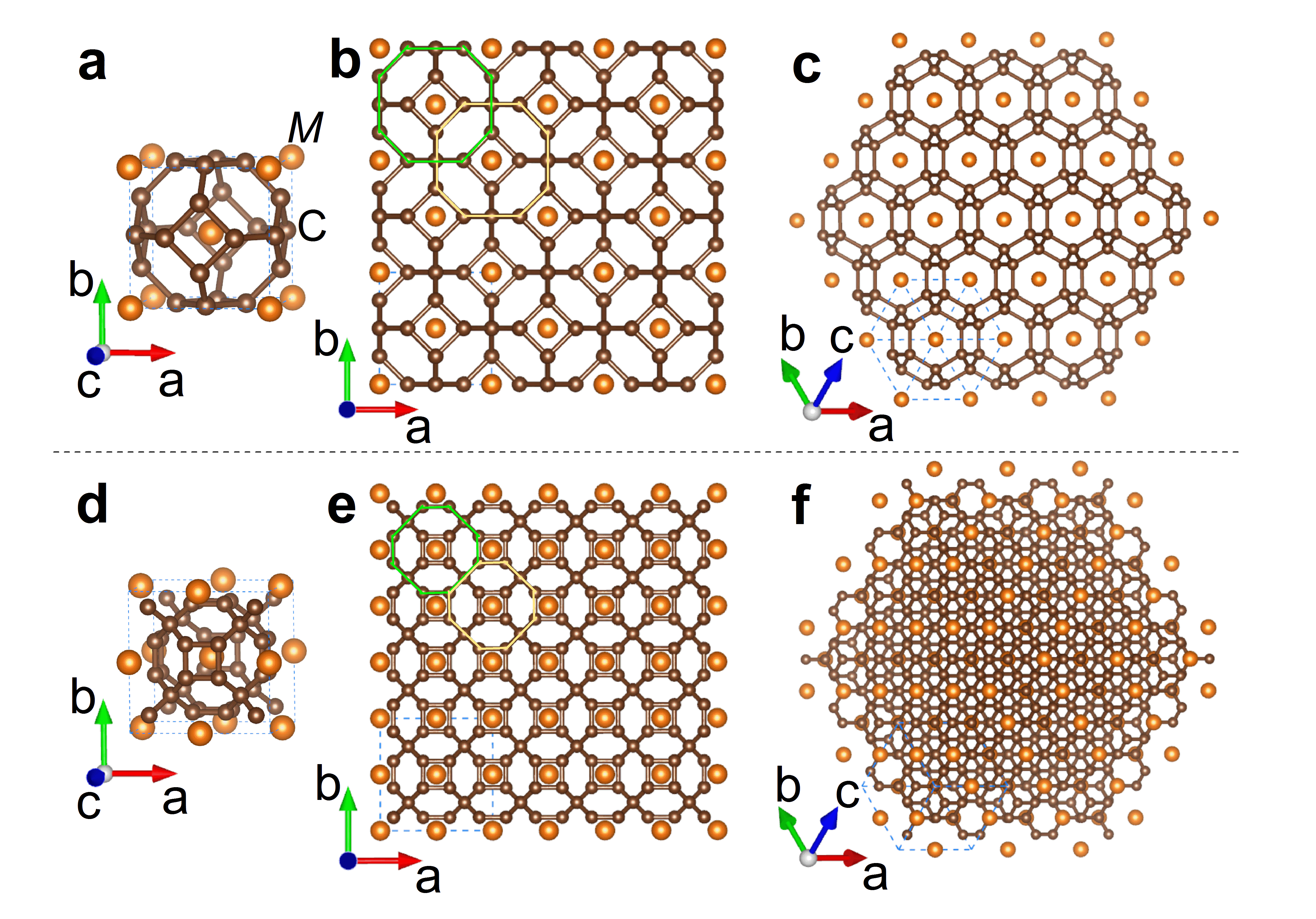 1.(a-(c)对应为C24笼单元和 C24笼耦合后形成的网络状结构,不同方向视图。(d-(f)对应为C32笼单元和 C32笼耦合后形成的网络状结构,不同方向视图。