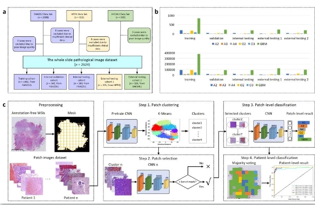 图2. 脑胶质瘤人工智能病理整合诊断系统的数据集和算法流程