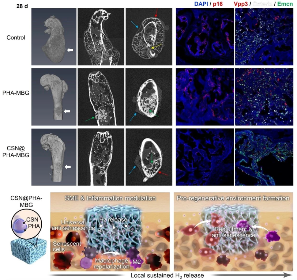 近期,集成所神经工程中心李光林/唐为研究团队联合上海交通大学氢科学中心何前军教授、华东理工大学刘昌胜院士在Nature Communications发表了题为Local H2 release remodels senescence microenvironment for improved repair of injured bone 的文章,共同提出了原位长效释氢阻止衰老进程、重塑老龄组织修复能效的策略,并系统探究了氢分子对于老龄骨组织中三类关键细胞(干细胞、巨噬细胞、骨细胞)衰老行为的影响。研究发现,氢分子具有广谱抗衰老效应,并展现出明显的SASP抑制效应(senomorphics)和一定程度的衰老细胞清除效应(senolytics)。基于此,团队设计、开发了一种具有高产氢率(911 mL/g)、良好生物相容性的硅化钙纳米材料(CaSi2,CSN),采用静电电喷策略以可降解聚合物聚羟基脂肪酸酯(Polyhydroxyalkanoate,PHA)为载体,将CSN与PHA电喷于介孔活性玻璃(Mesoporous Bioactive Glass,MBG)支架上,实现了体内原位超1周释氢,且较传统注射等量富氢水释氢量高46000倍。体内原位释氢显著性减缓了修复过程中多细胞衰老进程,介导衰老巨噬细胞抑炎极化和干细胞活性与功能维持,促进老龄骨缺损衰老与炎症叠加的病理微环境向促再生方向转化,有效实现24月龄老龄小鼠临界股骨缺损修复。