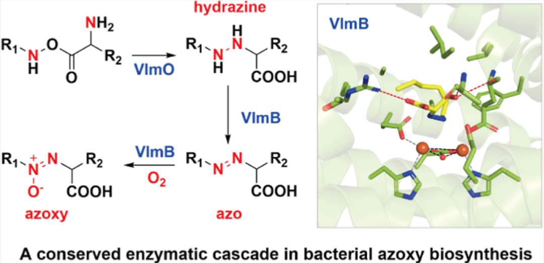 图1. 微生物中一种保守的氧化偶氮基团的酶促合成策略