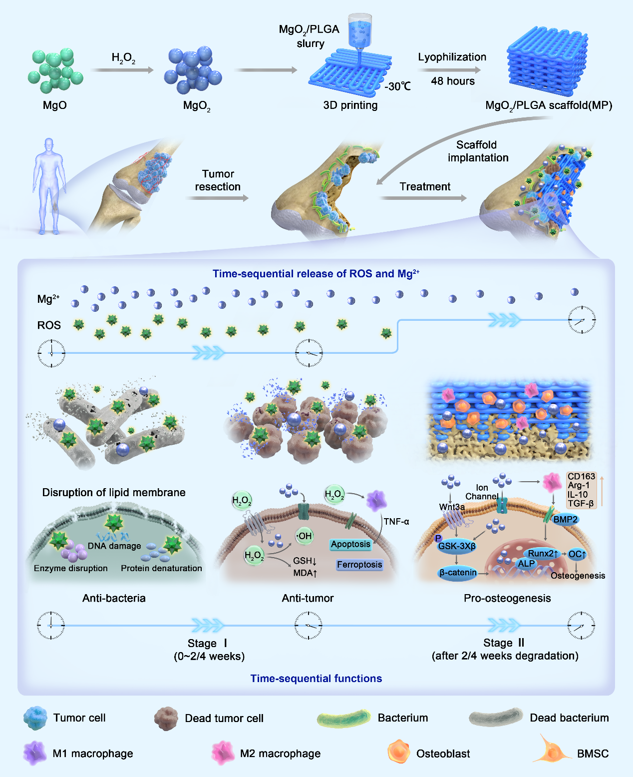 基于病理生理学的3D打印MgO2/PLGA支架设计理念示意图,以及时序性多功能活性用于骨肉瘤术后骨缺损修复的机制