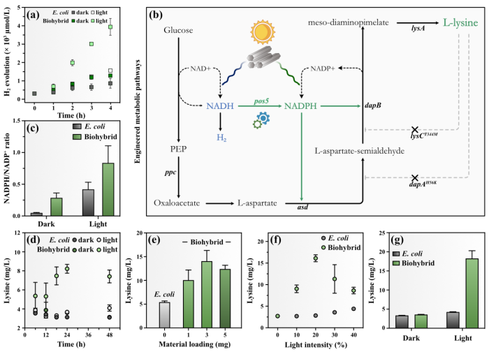 为了验证PCN-222可以作为大肠杆菌的电子供体,作者第一时间利用具备产氢能力的野生型大肠杆菌MG 1655与PCN-222结合构建杂合体。该体系实现了在光照下高效产氢,验证了可见光照射下PCN-222对大肠杆菌胞内能量供应有较好的促进作用。随后顺利获得基因工程改造,在大肠杆菌中过表达了赖氨酸合成途径,研究杂合体在黑暗及光照下的赖氨酸合成性能,并分别顺利获得时间梯度、材料与大肠杆菌杂合的时间点、材料的浓度、光照强度四个维度对PCN-222-大肠杆菌杂合体系光驱产赖氨酸性能进行了优化。